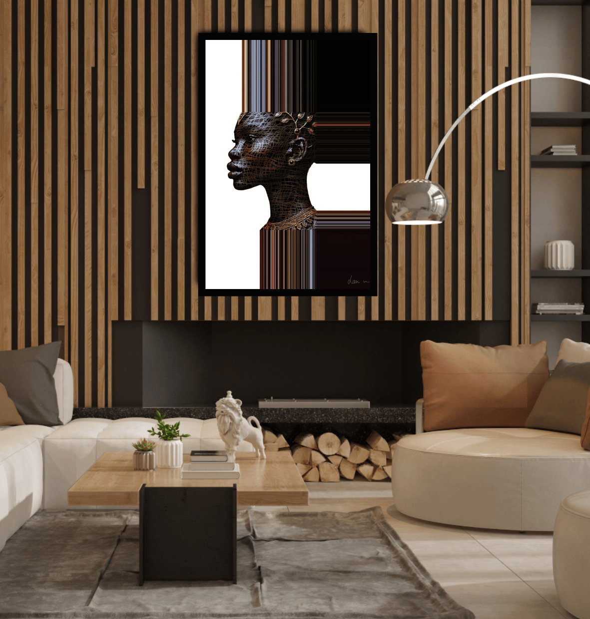À propos de l’œuvre : Une reine d’ombre et de lumière s’élève, drapée de mystère et de grâce. Son regard, bien que dissimulé, semble percer les voiles du monde, projetant une présence à la fois silencieuse et éclatante. Les ornements qui parent sa tête et son cou sont comme des branches d’or, des fils tissés par le vent et la mer, des fragments de nature venus épouser son être. Chaque courbe, chaque ligne évoque une histoire murmurée par le temps, un souffle ancien qui traverse l’espace et s’épanouit en elle. C’est un être entre deux mondes, figé dans l’éternité d’un instant.